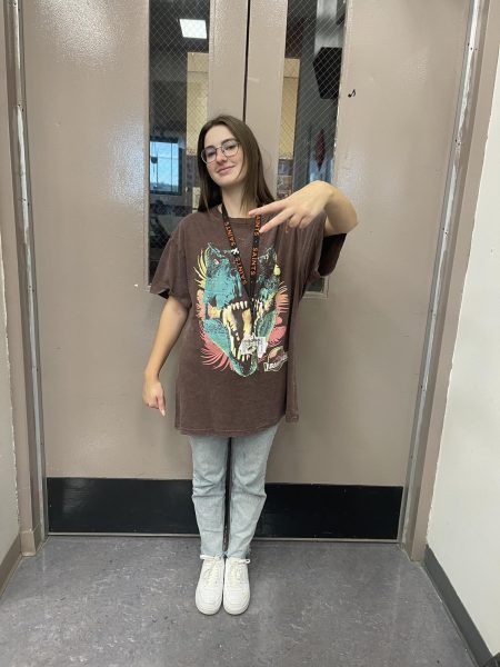 Hawaiian Day was our fourth Spirit Week theme. Dorothy Hocker, another senior at East, portrayed this theme with a masterful vision. When asked about her outfit, she said, “I’m wearing the teacher Hawaiian shirt from [the] 2024-2025 [school year], the green and orange one.” When asked how she acquired this shirt, she said, “A teacher gave it to me because I asked, [and] because it’s really ugly and I think it’s really funny.” Her outfit was beautifully hideous due to the nastiness of the 24-25 teacher shirt, yet she pulled it off with grace.