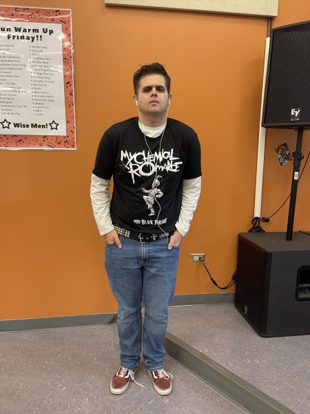 The third day of Spirit Week, Dress Your Decade Day, had many funky outfits. The most creative look I saw was represented by the Senior class, thanks to Vince Minaglia. He wore “…an MCR shirt from Hot Topic, a white undershirt, studded belt from Hot Topic, jeans, maroon Vans and wired earbuds.” When asked about how he came up with his outfit, he said, “I just went to Hot Topic and then I got the shirt and then this is like most of what I usually wear, other than the eyeliner and the black hairspray.” I then asked why he chose that specific look from the 2000’s and he replied, “Because when I think of 2000s, I think emo.” The look was one of the coolest ones I saw over the entire week.